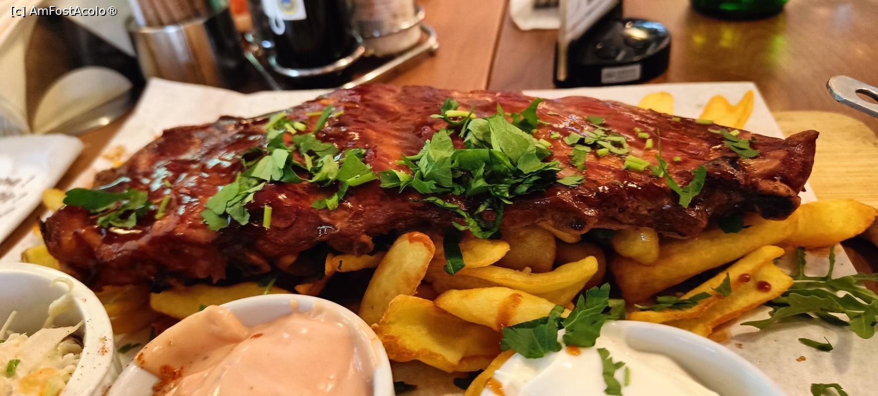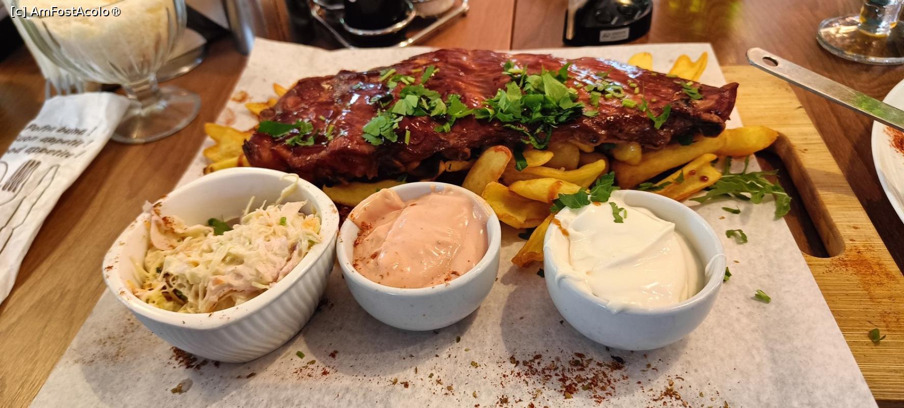 [P08] Coastă de porc cu cartofi și sosuri.