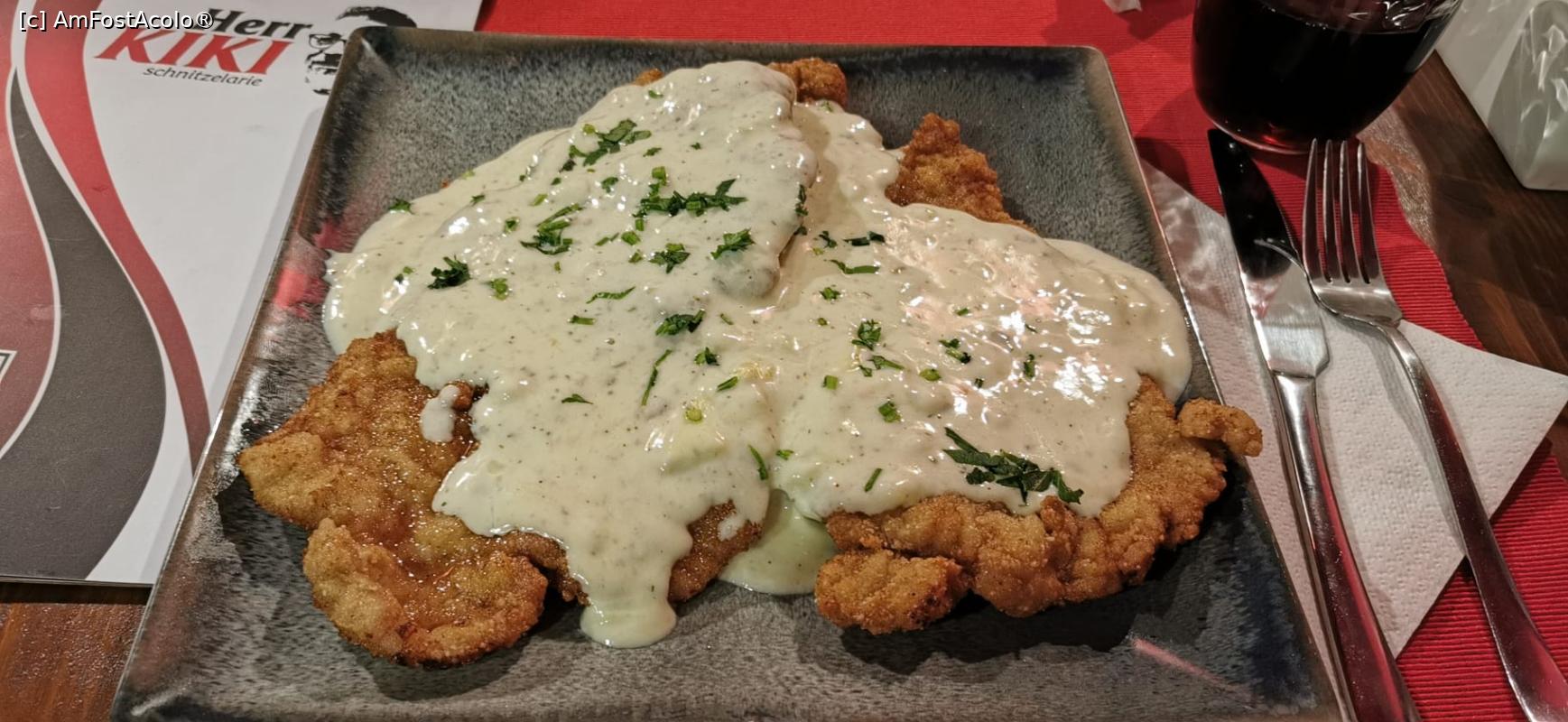 [P01] Șnițelul Kase Sosse din piept de curcan, panko, sos de brânzeturi fine cu rucola