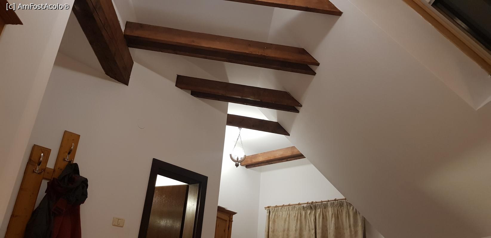 [P01] Peretele inclinat de sub sarpanta care urca spre tavanul inalt si sprijinit de grinzile grele, rustice.