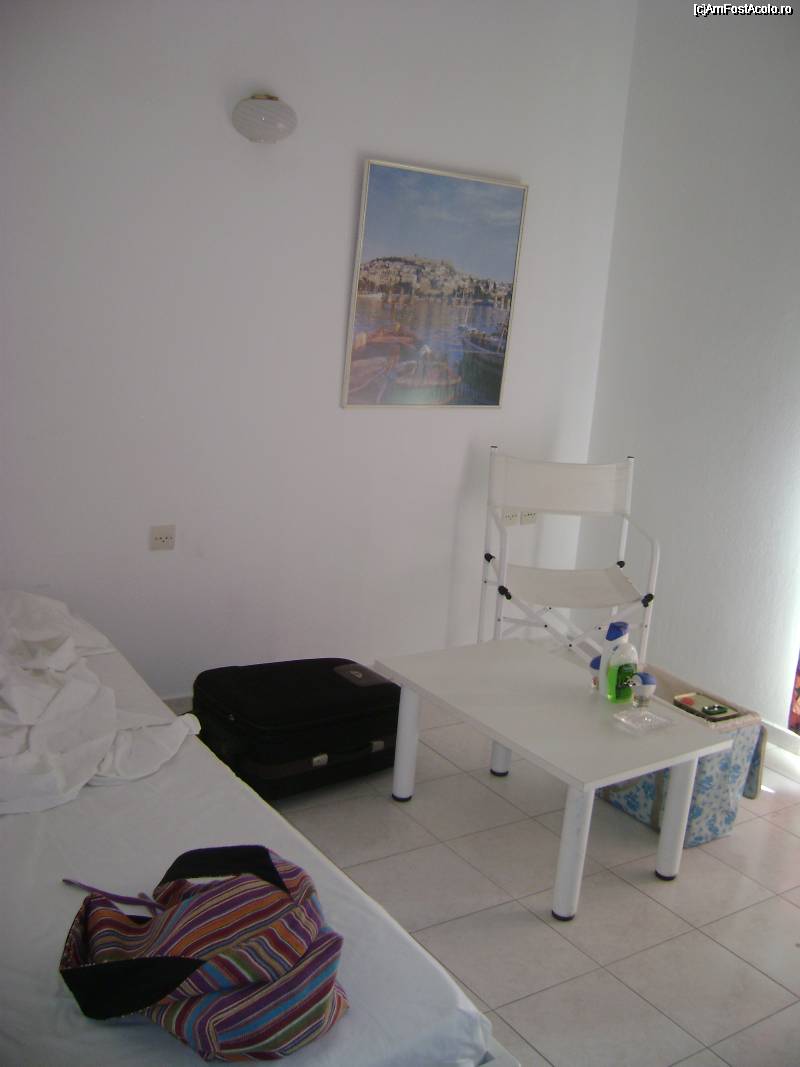 [P05] O parte din dormitor. In dreapta nu se vede un mare sifonier in perete, iar in stanga este AC si o masa cu scaun, TV agatat in perete.