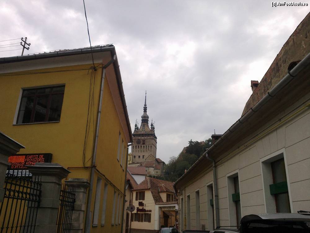 [P17] Pensiunea in capatul strazii, iar in spate se vede turnul cu ceas din cetate