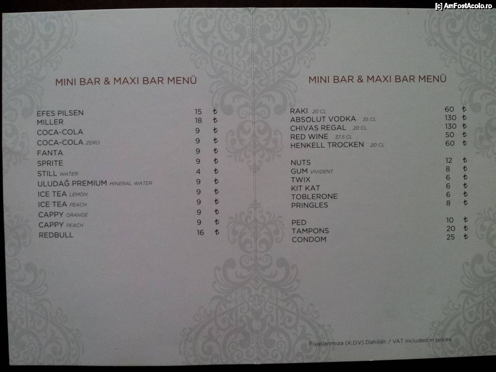 2. In camera bar dotat exemplar: 65 $ sticla 35 cl de votka ABSOLUT, sau 65$ CHIVAS REGAL sticla de 20 cl., EFES PILSEN de 33 cl. 7,5$, REDBULL 8$, PRINGLES 4$, ICE TEA 4,5$ etc.