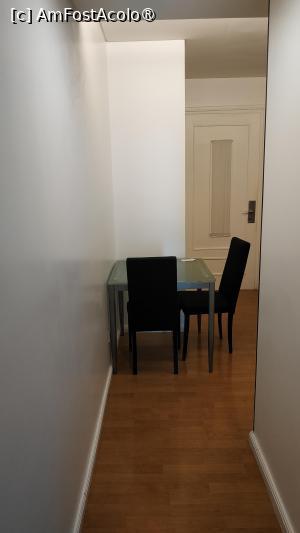 Cum deschideai ușa, intrai într-o mică anticameră unde se afla o chicinetă discretă, o canapea și o măsuță cu două scaune, un spațiu practic pentru cafea sau pentru a servi masa. De aici se făcea accesul spre baie, care era dotată cu cadă, iar mai departe se afla camera de dormit, cu două paturi twin. Mobilierul era simplu, în tonuri neutre, gri, negru, alb iar accentele de culoare portocaliu de la perne, mai înveseleau puțin camera. Tavanele erau destul de înalte, ceea ce făcea ca spațiul să pară și mai aerisit.