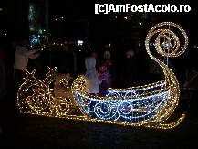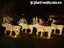 La Unirii ne-au intampinat ornamentele din fantani (care aveau apa oprita) si muzica ce razbatea pana la statia de tramvai de la concertul din parc. Marcel Pavel tocmai incanta audienta cu "Frumoasa mea", insa nu ne-am oprit, am mers pana la Casuta Mosului amenajata sub un brad frumos impodobit. Se intra pe rand si dupa ce asezai copilul langa Mosul (care mi s-a parut cam plictisit si fals, nu ca cel din Liberty Mall cu barba naturala si atractie fata de copii), un fotograf iti facea o poza pe care ti-o inmana dupa un minut, contra cost - 20 ron. Aglomeratie mare, am intrat si noi dupa circa 30 min si la iesire ne-am facut inventarul in buzunare de la cate pipaieli primisem. Imbranceli de peste tot, am vrut sa-i fac o poza fetitei intr-o sanie trasa de reni dar m-am lipsit, alti trei parinti aveau aceeasi intentie.