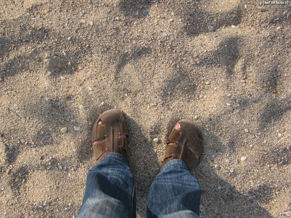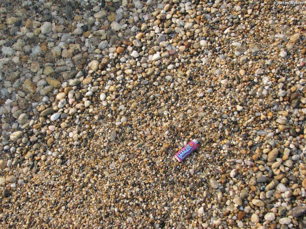[P22] Asa arata "nisipul" din Paralia Vrasna. Ca un prundis de rau. Am folosit o bricheta de marime obisnuita, ca etalon pentru dimensiune.