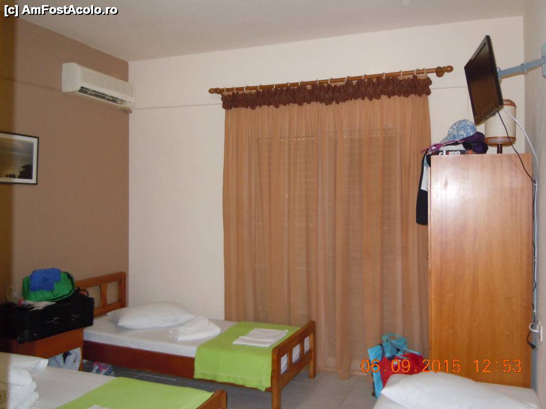 [P15] Camera de patru persoane (in stanga pat dublu, cel simplu si in dreapta patul suplimentar), AC, dulapul, TV si usa spre balconul camerei
