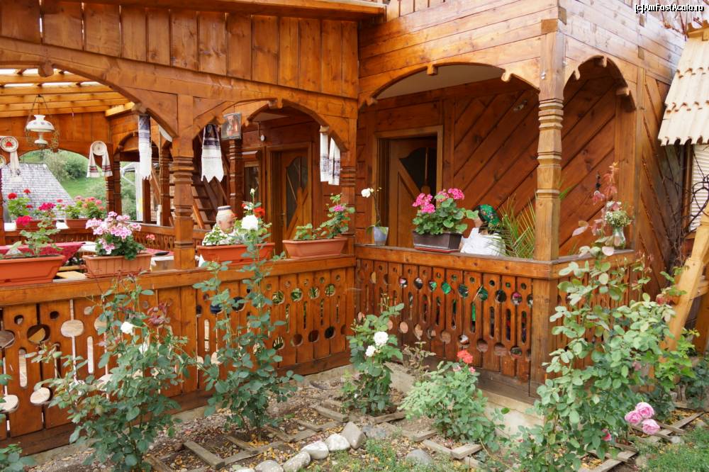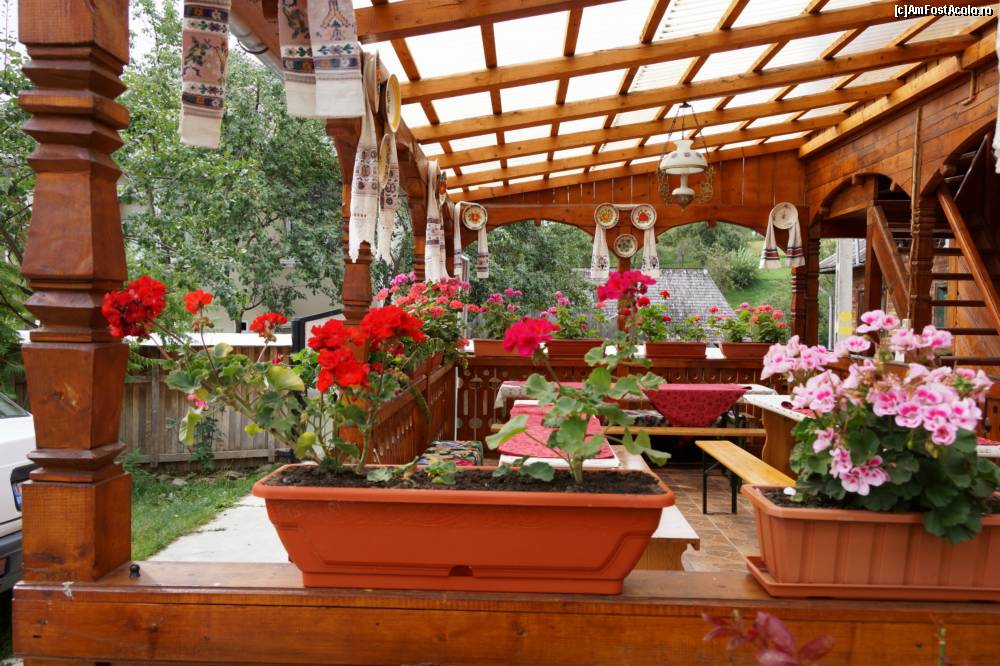 [P27] Terasa acoperită. Foarte frumos decorată şi plină de flori. Când este cald afară este o plăcere să ieie masa de seară aici. În dreapta se vede mai clar scara ce duce la camerele de la etaj.