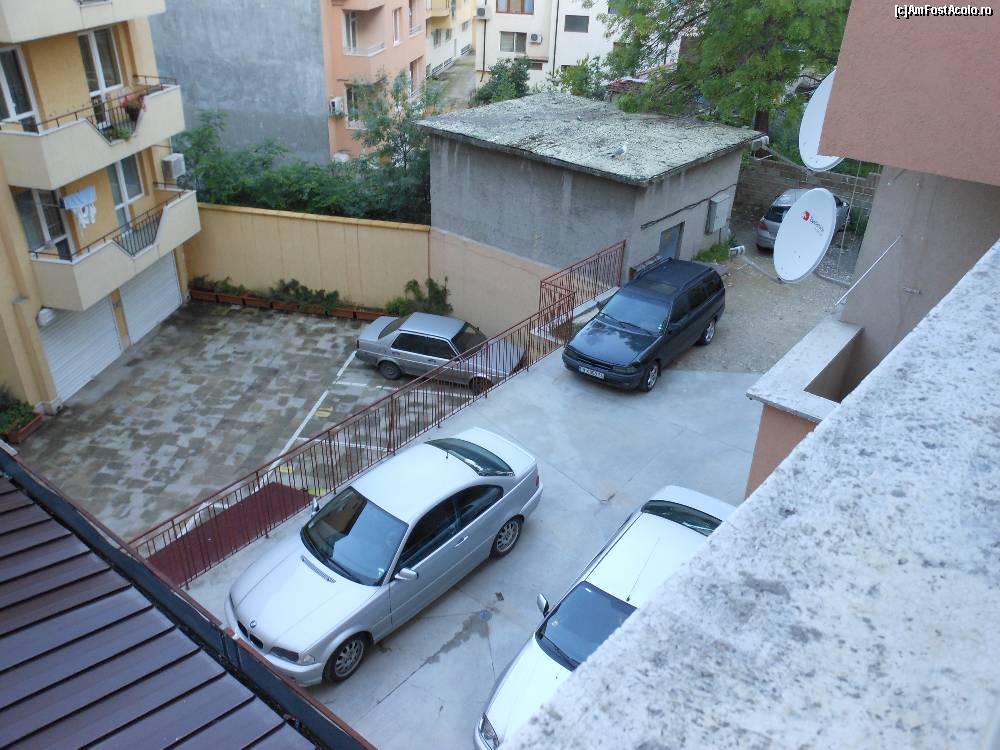 [P20] Varna - Hotel Sorbona, vedere din balconul camerei 203 A. Curte interioara ingusta si parcare.