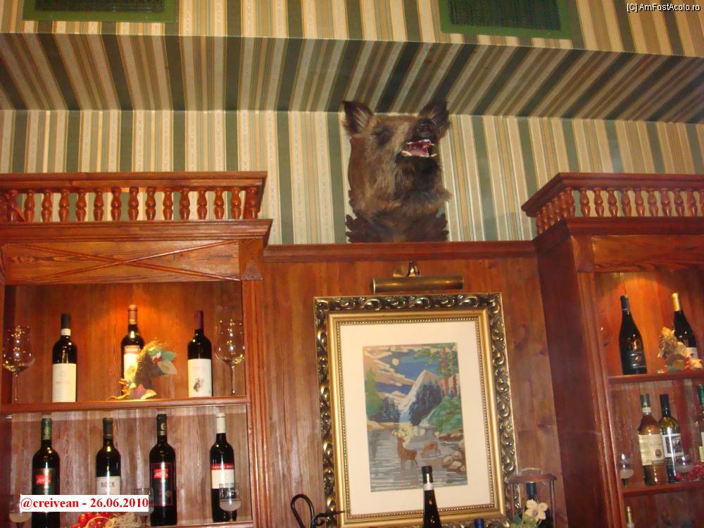 [P03] Restaurantul Karikas - Sala Vânătorului, vinurile xpuse şi trofeul de urs.